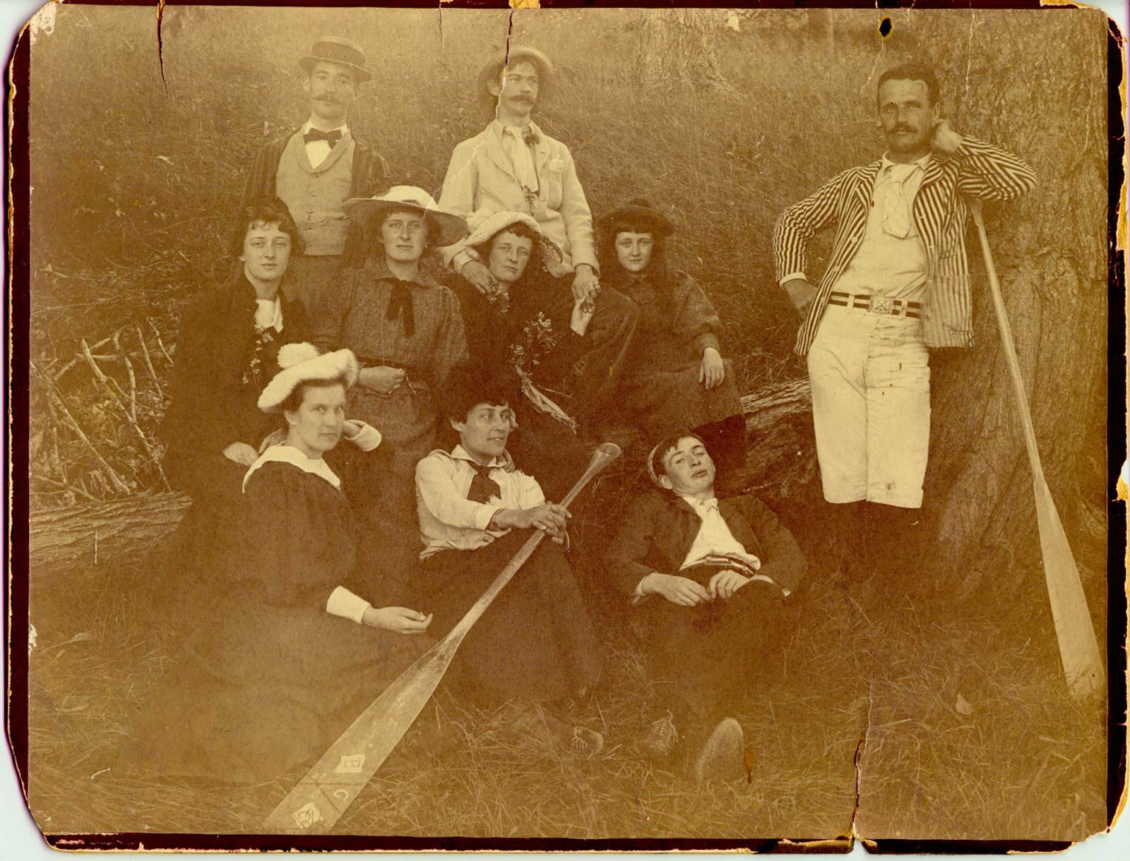 A gentleman on the far right leans against a paddle with some interesting features. The throat of the blade has carved notches where it meets the shaft. Likewise, the base of the pear-shaped grip also has decorative notches. The pattern is not unlike a late 19th century one used by the Lakefield Canoe Company featured in an earlier post here.